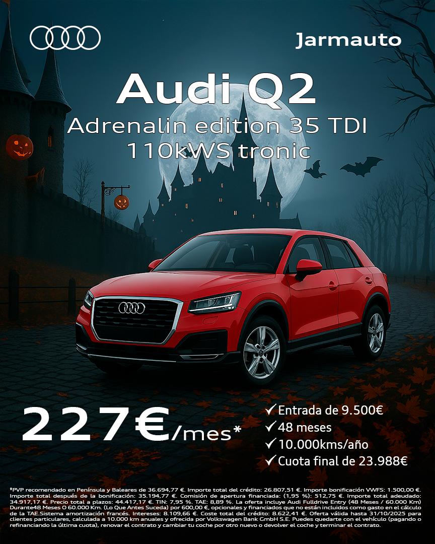 *PVP recomendado en Península y Baleares de 36.694,77 €. Importe total del crédito: 26.807,51 €. Importe bonificación VWFS: 1.500,00 €. Importe total después de la bonificación: 35.194,77 €. Comisión de apertura financiada: (1,95 %): 512,75 €. Importe total adeudado: 34.917,17 €. Precio total a plazos: 44.417,17 €. TIN: 7,95 %. TAE: 8,89 %. La oferta incluye Audi Fulldrive Entry (48 Meses / 60.000 Km) Durante48 Meses O 60.000 Km. (Lo Que Antes Suceda) por 600,00 €, opcionales y financiados que no están incluidos como gasto en el cálculo de la TAE.Sistema amortización francés. Intereses: 8.109,66 €. Coste total del crédito: 8.622,41 €. Oferta válida hasta 31/10/2025 para clientes particulares, calculada a 10.000 km anuales y ofrecida por Volkswagen Bank GmbH S.E. Puedes quedarte con el vehículo (pagando o refinanciando la última cuota), renovar el contrato y cambiar tu coche por otro nuevo o devolver el coche y terminar el contrato.