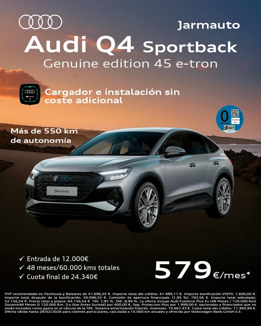 - Audi Q4 45 e-tron: Potencia de 281 CV con una autonomía máxima de 550 km.